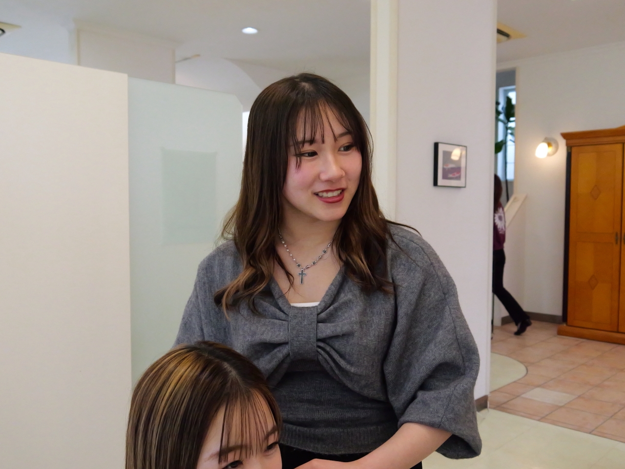 主にアシスタント業務を担当しており、電話対応や受付、お客様のご案内を行っています。施術では、シャンプーやカラーの補助、アイロンを使ったスタイリングなど、スタイリストのサポートをしています。